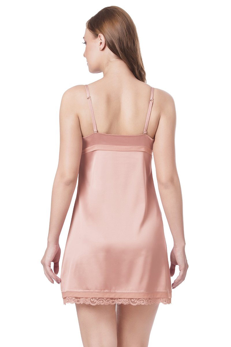 This bridal sleepwear chemise provides comfort from the rich satin bodice and the soft gallon lace. The delicate lace edge detail along the neckline and hem elevates the feminine touch of the style. The long mesh paneled neckline, under bust and hem continue to compliment the chemise along with the added elegance from the rouleau straps and the two-toned rosette bow.