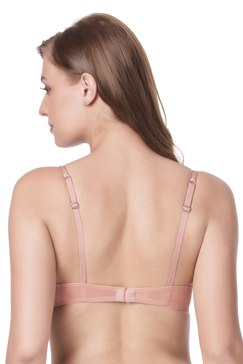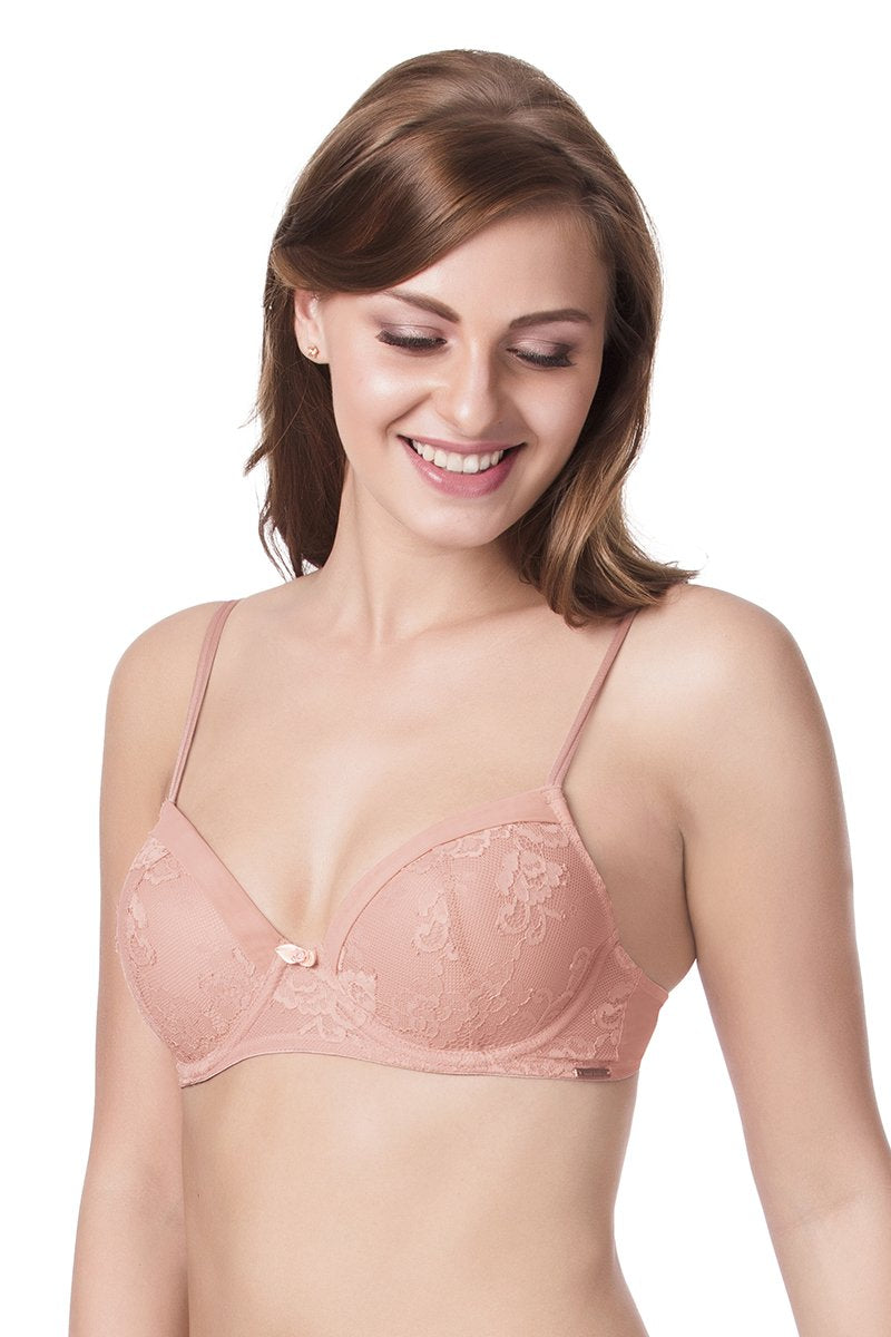 Giving a modest yet elegant look, this demi bra has cups over laid with soft floral lace. Padded, wired this bra has a mesh panel neckline for clean look while the rosette bow and elegant straps add glamour to this style. Pair it with the matching bikini and complete the look.