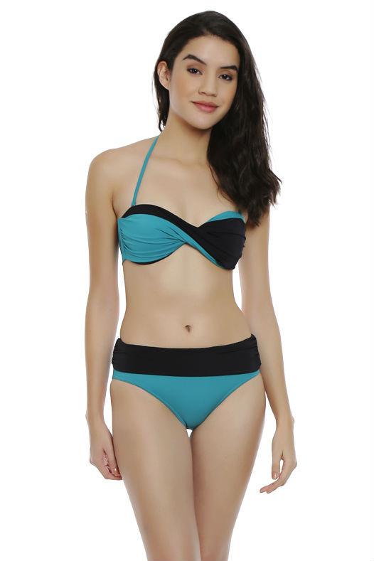 Be a tease in this twisted bandeau with contrast cups and halter tie up. Match it with the ruched bikini bottom to complete your swim outfit!